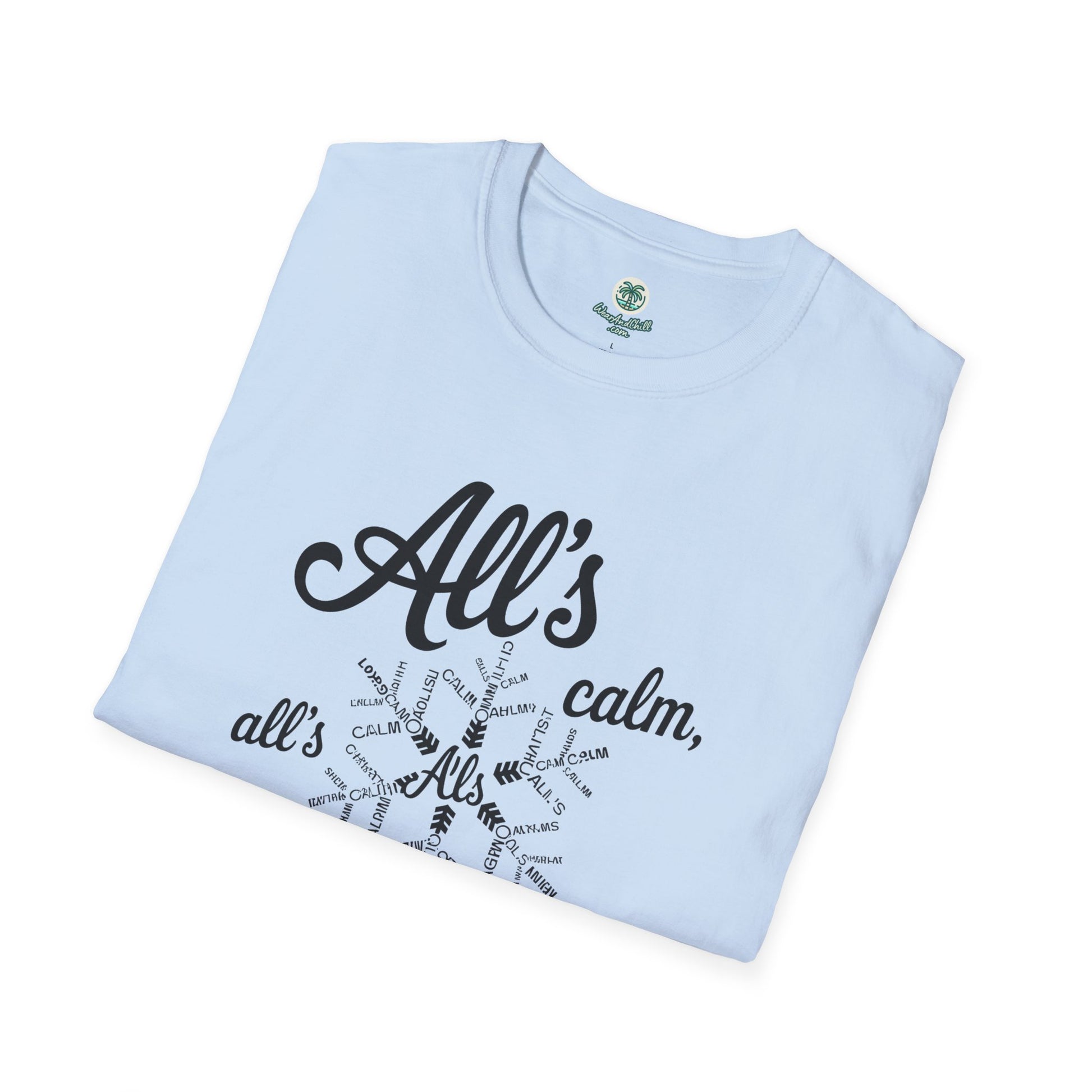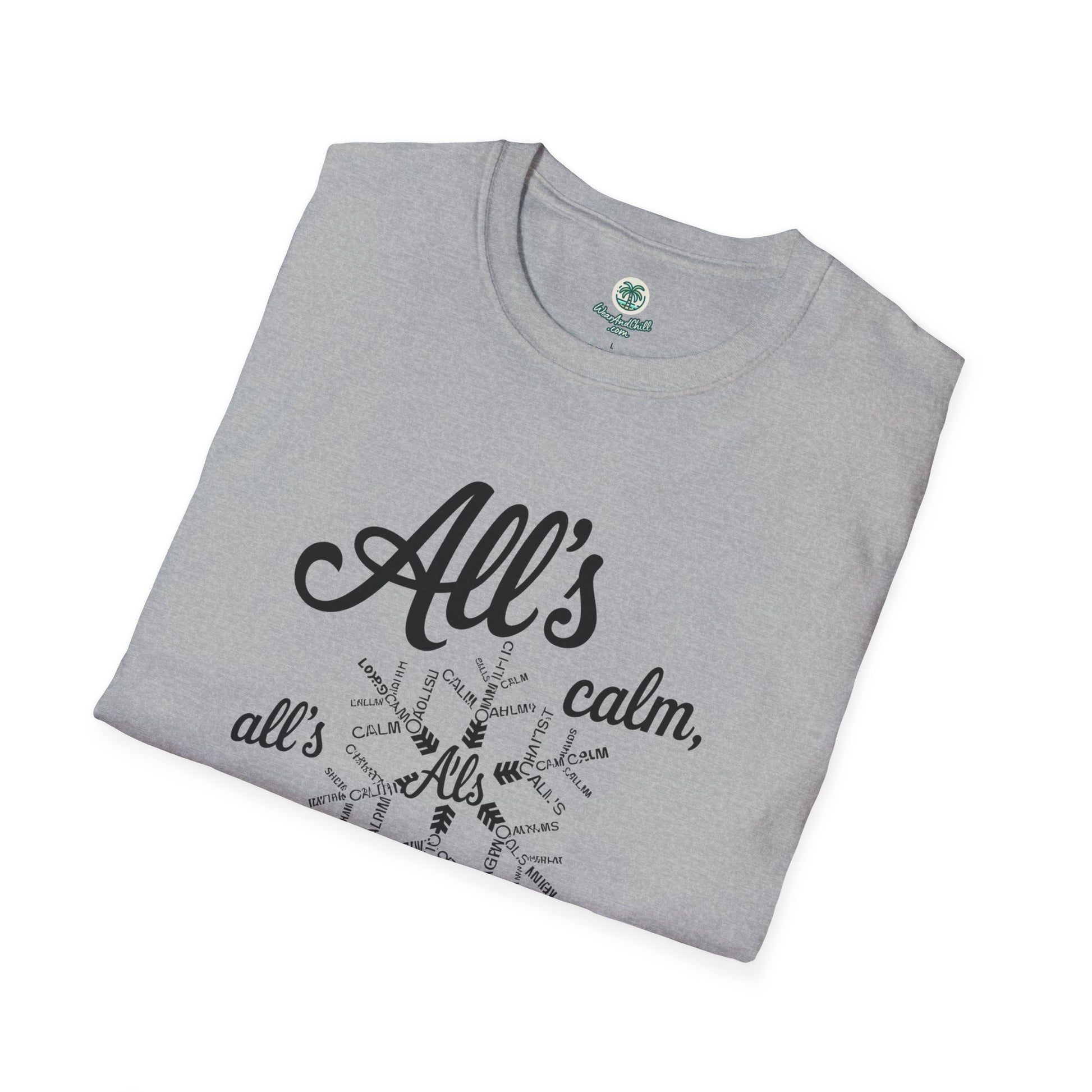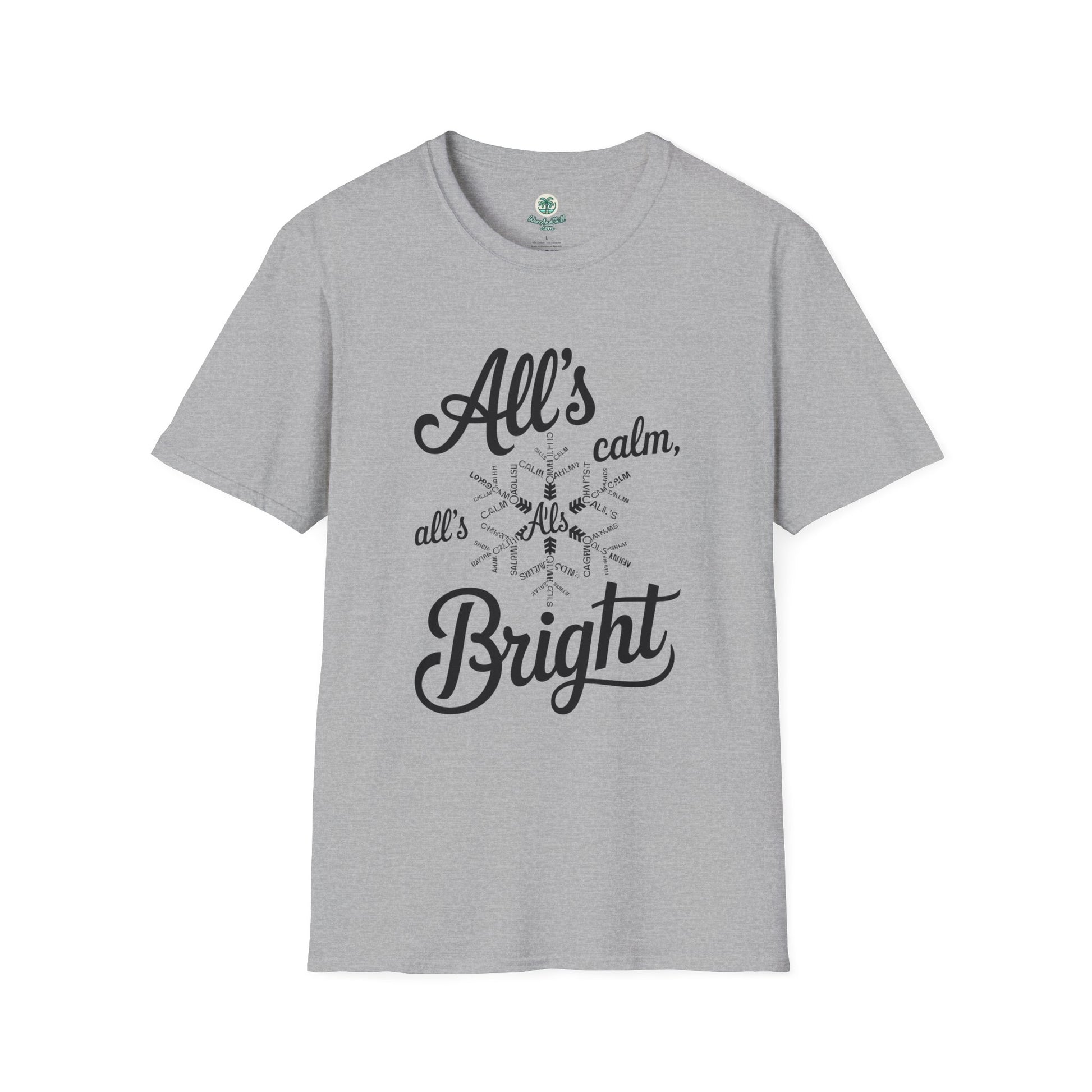 Embrace the spirit of the season with our "All's Calm, All's Bright" t-shirt from the Christmas Phrases Collection. Crafted from ultra-soft, high-quality cotton, this tee promises unmatched comfort and durability. The elegant design features a festive script that captures the essence of a serene holiday. Perfect for gatherings, gift-giving, or spreading joy and cheer, it's a must-have for the holidays. Available in multiple sizes and colors to suit your style. Celebrate the magic of Christmas with every wear. Whether for you or a loved one, this t-shirt is sure to make the season merry and bright.