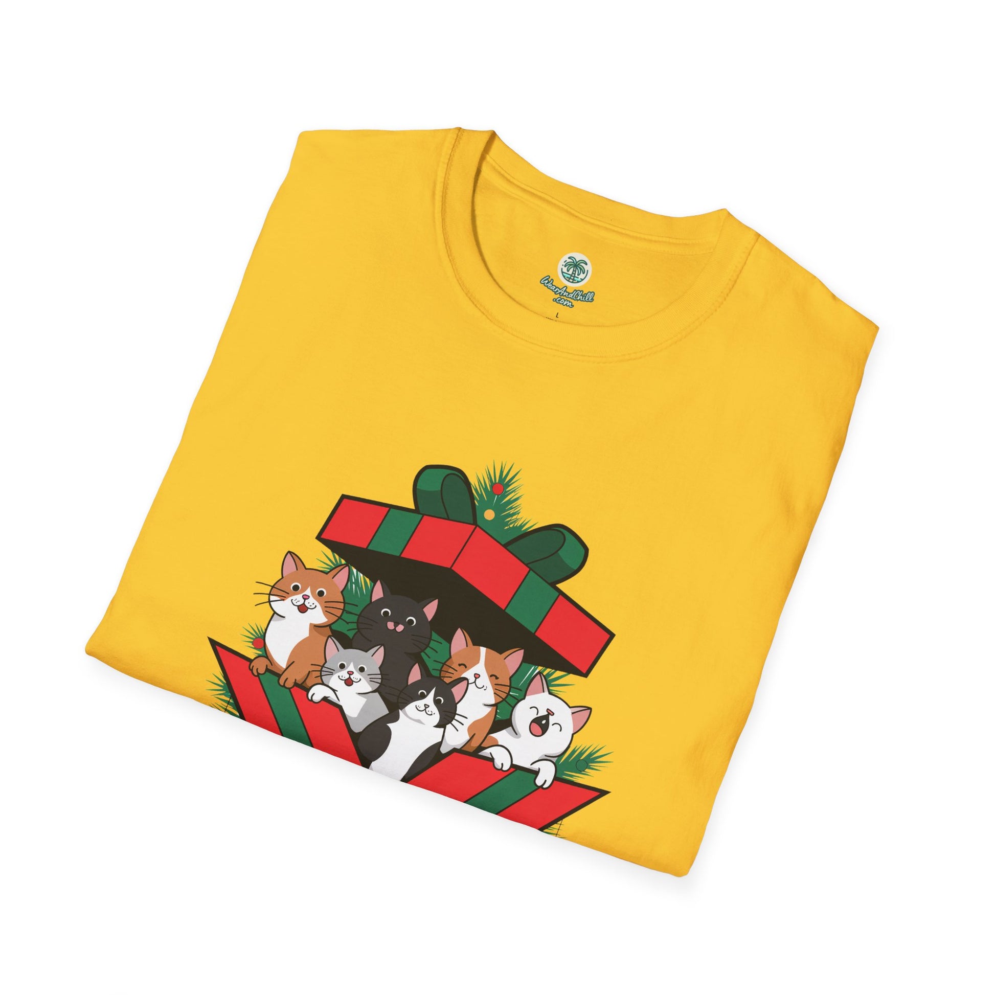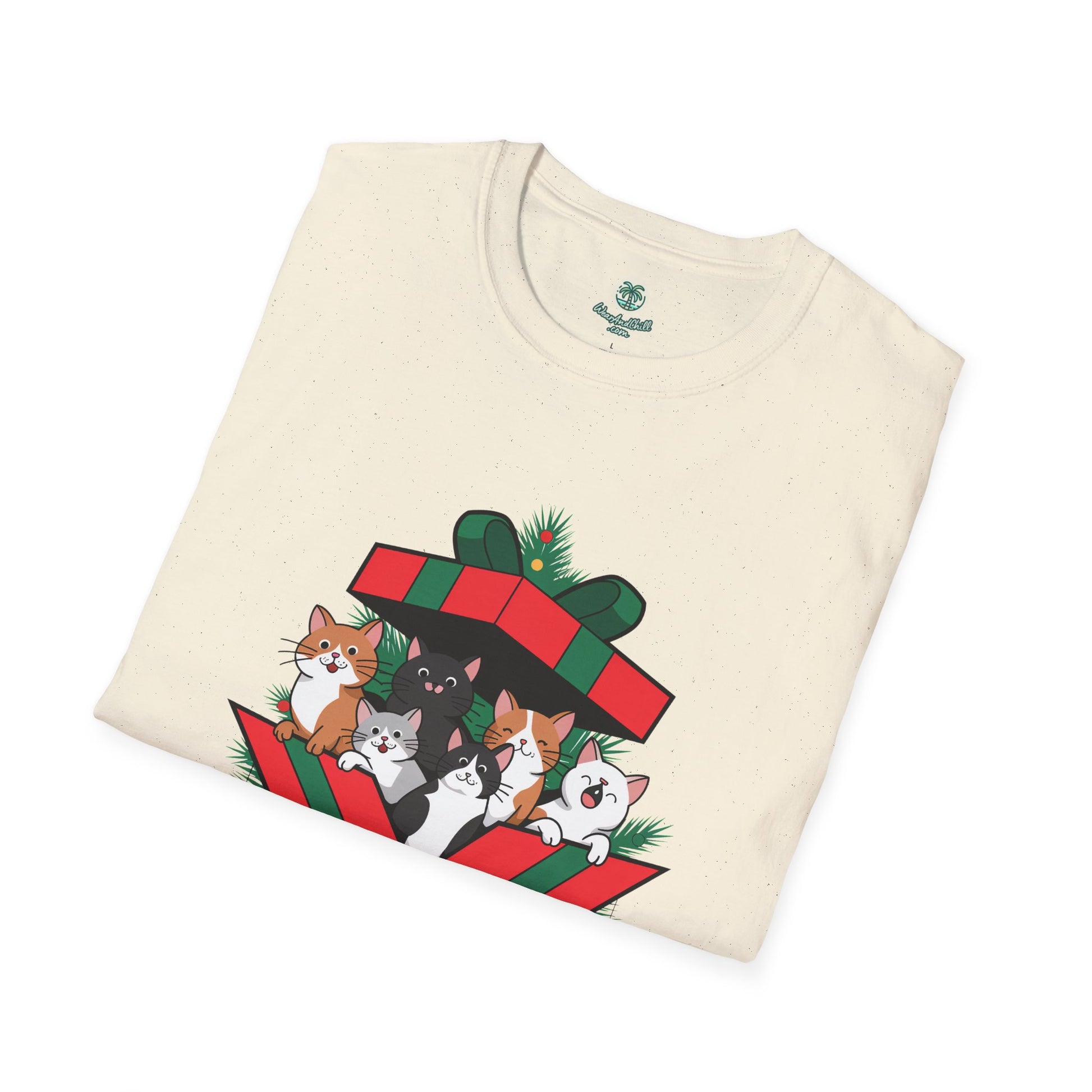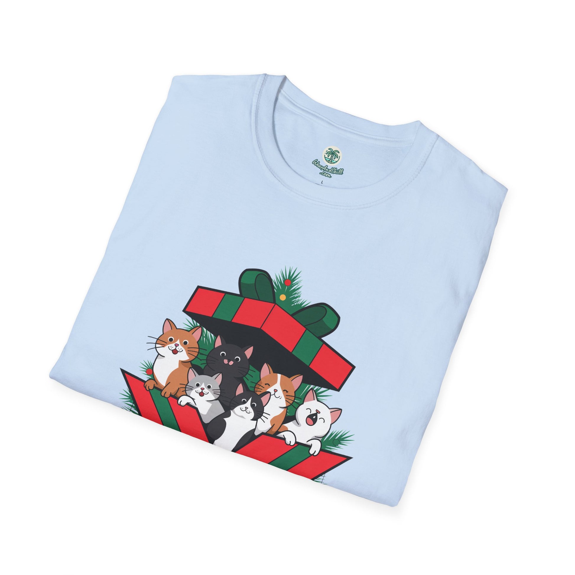 Unwrap the purr-fect holiday surprise with our "Cats Popping Out of a Giant Gift Box" T-Shirt from the Christmas & Cats Collection. This whimsical design features adorable cats playfully emerging from a festive box, capturing the joy and wonder of the holiday season. Made from soft, breathable cotton, this t-shirt ensures all-day comfort. It's the ideal gift for cat lovers and holiday enthusiasts alike. Celebrate Christmas with a touch of feline fun—because every cat is a gift! Available in a variety of sizes for the perfect fit. Spread cheer and charm this season with this unique design.