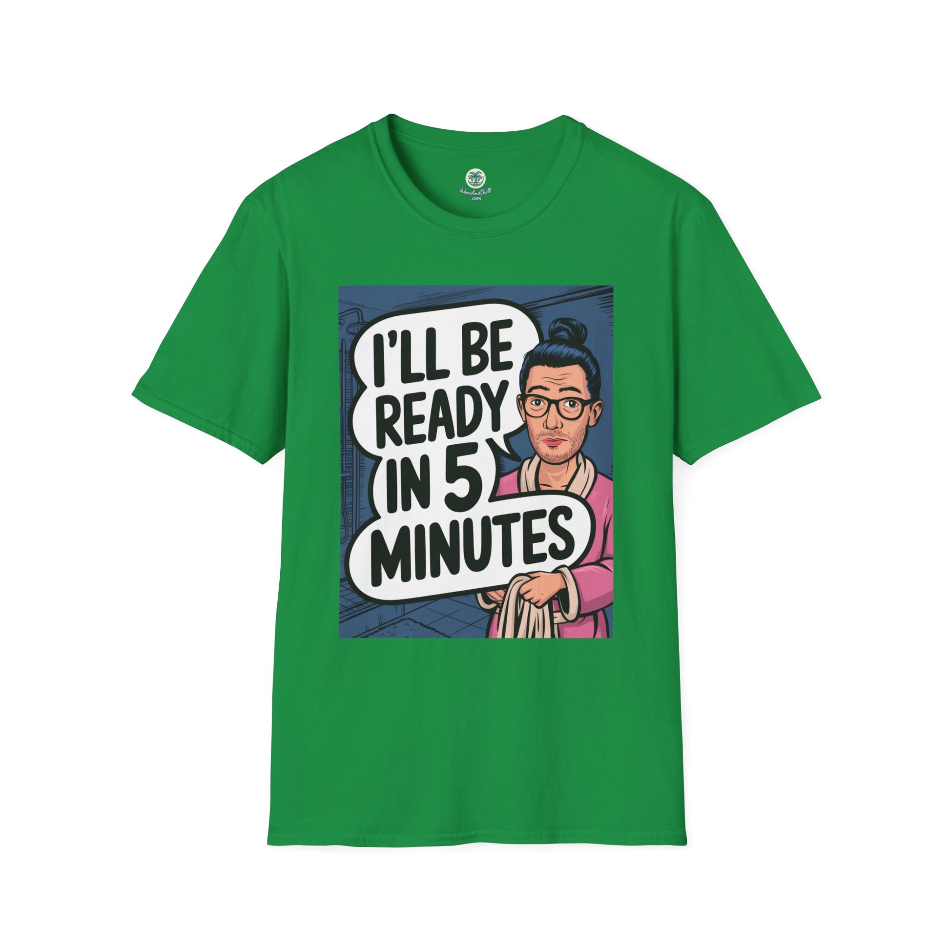 Get ready to make a statement with our "I'll be Ready in 5 Minutes" T-shirt! Perfect for those who appreciate a bit of humor and irony, this shirt is both comfy and stylish. Crafted from high-quality cotton for a soft feel, it features a bold, eye-catching print. Ideal for casual outings or lounging at home, this tee is sure to become a wardrobe favorite. Show off your witty side and grab this must-have piece today!